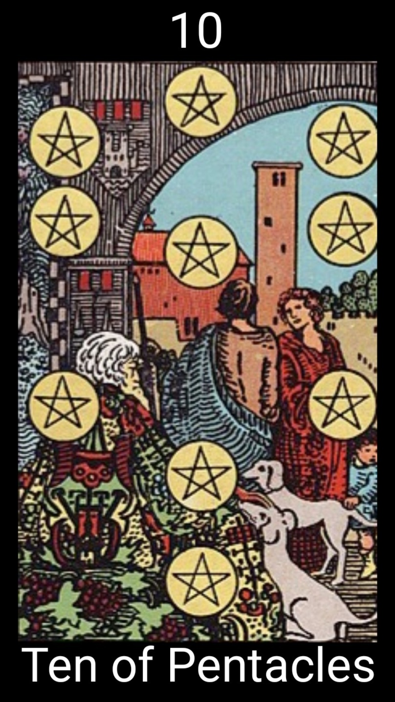 इस कार्ड पर 10 नंबर अंकित होता हैं। यह पेंटाकल्स सूट का दसवाँ कार्ड हैं।