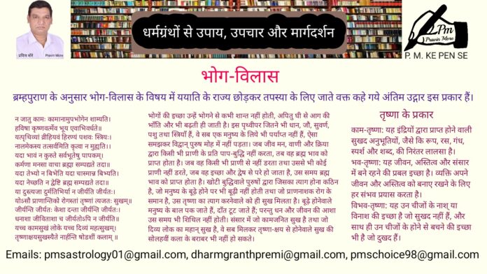 ब्रम्हपुराण के अनुसार भोग-विलास के विषय में ययाति के राज्य छोड़कर तपस्या के लिए जाते वक्त कहे गये अंतिम उद्गार इस प्रकार हैं।